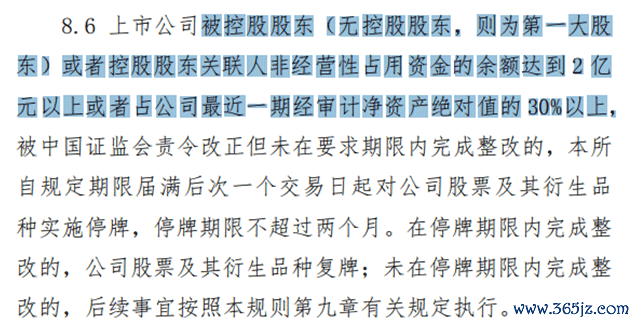 4月30日,沪深交易所发布退市新规,新增占用资金退市情形,明确规定公司被控股股东及其关联人非经营性占用资金的余额达到2亿元以上或者占公司最近一期经审计净资产绝对值的30%以上,被中国证监会责令改正但未在要求期限内完成整改的,依序停牌2个月,实施退市风险警示2个月后退市。