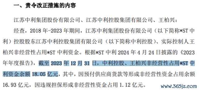公告显示,2018年至2023年期间,*ST中利控股股东中利控股、实际控制人王柏兴非经营性占用*ST中利资金。截至2023年末,中利控股、王柏兴非经营性占用*ST中利资金余额18.05亿元。