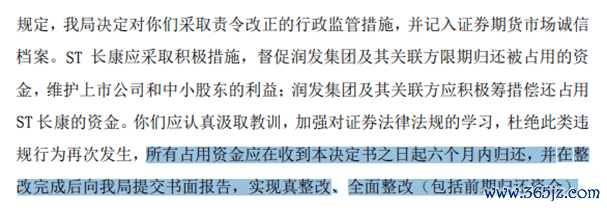 根据相关规定,江苏证监局决定对ST长康及润发集团采取责令改正的行政监管措施,并记入证券期货市场诚信档案。同时,江苏证监局要求润发集团及其关联方在收到本决定书之日起六个月内归还所有占用资金,并在整改完成后向江苏证监局提交书面报告,实现真整改、全面整改(包括前期归还资金)。
