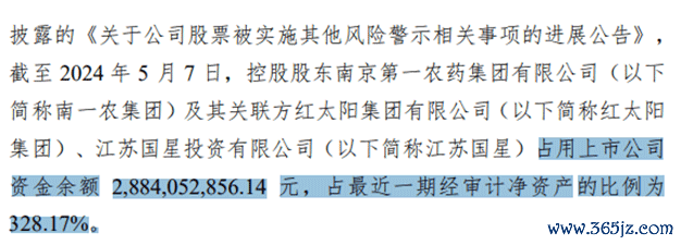 根据ST红太阳公告,截至2024年5月7日,控股股东南一农集团及其关联方红太阳集团、江苏国星占用上市公司资金余额约28.84亿元,占最近一期经审计净资产的比例为328.17%。据此,江苏证监局决定对ST红太阳、南一农集团、红太阳集团、江苏国星采取责令改正的监管措施,并将相关情况记入证券期货市场诚信档案;同时要求南一农集团及其关联方,限期六个月内归还占用资金。