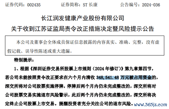 以ST长康为例,江苏证监局指出,经查,ST长康控股股东润发集团及其关联方前期存在非经营性占用ST长康资金的行为。根据ST长康公告,截至2024年5月6日,资金占用余额为34.85亿元,占2023年末净资产的93.44%。